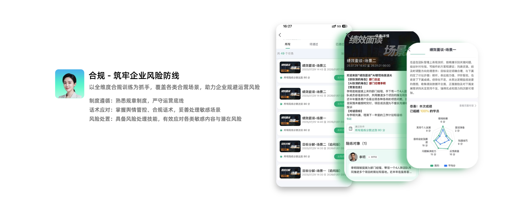 因传统线上考试时效低、门店带训受个人影响及主推产品卖点终端掌握不佳等痛点,通过话术陪练拆分产品知识并针对不同顾客画像开展销售接待陪练,最终实现训练覆盖 1000 人、300 家店,推广周期缩短至 20 天,考核效率较传统方式提升 30%。