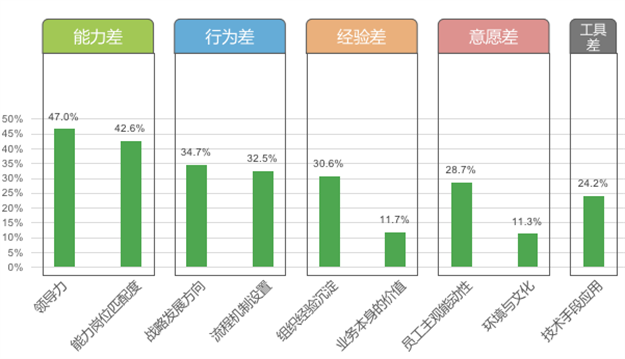 但人效提升是一项系统性的工程,牵涉到企业的方方面面。《企业人效白皮书》调研结果显示,影响企业人效的因素很复杂,包含人的因素、策略执行因素、企业知识水平、业务和产品因素等等,如图: