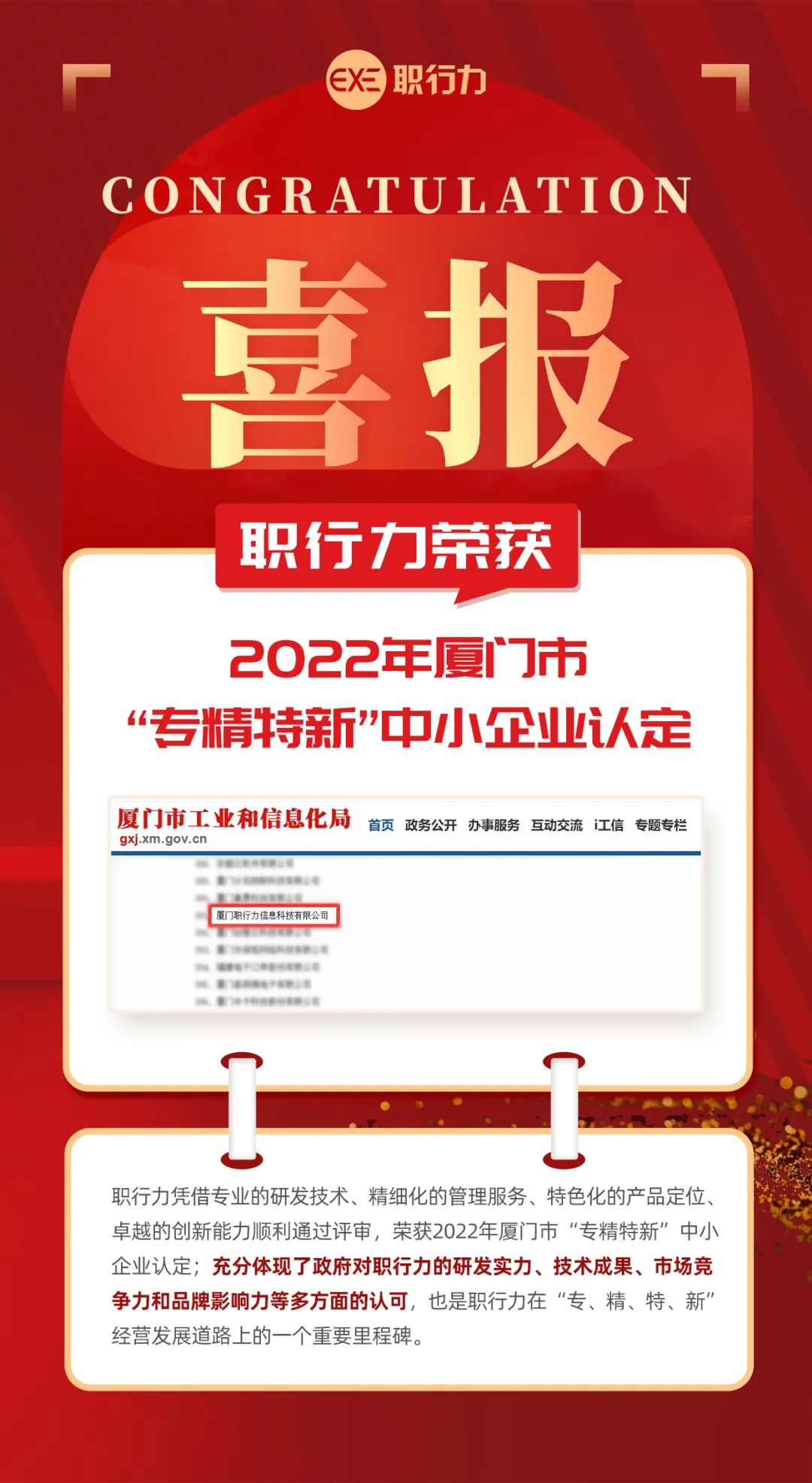 近日,厦门市工业和信息化局公布了2022年厦门市“专精特新”中小企业认定名单;厦门职行力信息科技有限公司榜上有名。